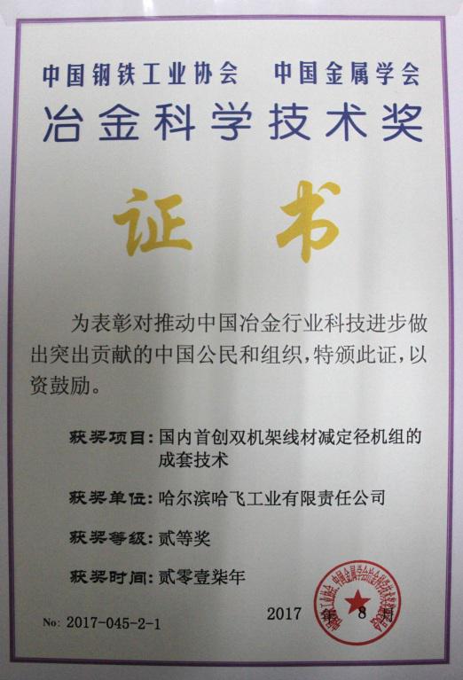 為表彰對(duì)推動(dòng)中國(guó)冶金行業(yè)科技進(jìn)步做出的突出貢獻(xiàn),冶金科學(xué)技術(shù)獎(jiǎng)獎(jiǎng)勵(lì)委員會(huì)決定對(duì)78個(gè)項(xiàng)目授予2017年中國(guó)鋼鐵工業(yè)協(xié)會(huì)、中國(guó)金屬學(xué)會(huì)冶金科學(xué)技術(shù)獎(jiǎng),我公司“國(guó)內(nèi)首創(chuàng)雙機(jī)架線材減定徑機(jī)組的成套技術(shù)”獲得二等獎(jiǎng)。我公司是冶金系統(tǒng)外的冶金設(shè)備制造商獲得此獎(jiǎng)項(xiàng),標(biāo)志雙機(jī)架線材減定徑機(jī)組成套技術(shù)對(duì)中國(guó)冶金行業(yè)科技創(chuàng)新、技術(shù)進(jìn)步有重要意義。
